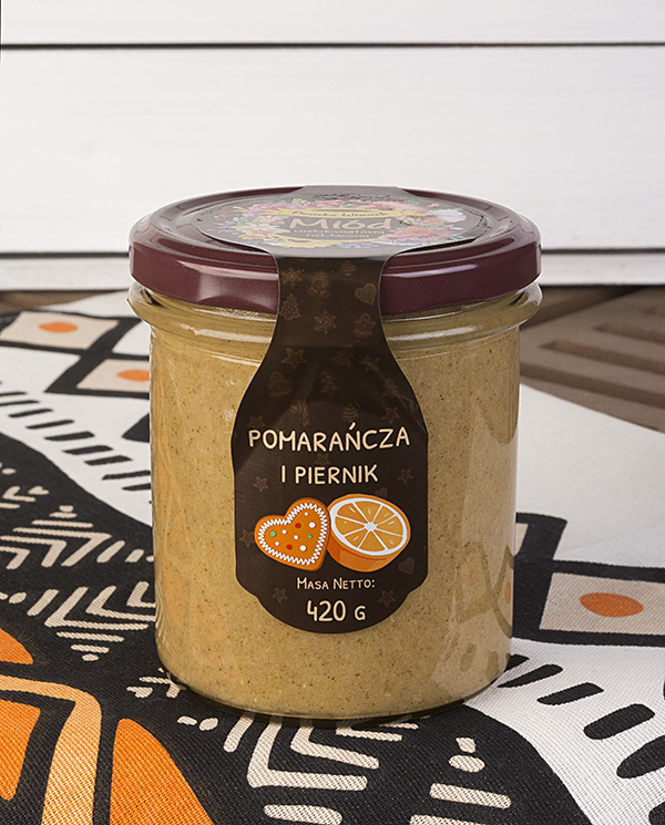 Miód z liofilizowaną pomarańczą i przyprawami korzennymi.